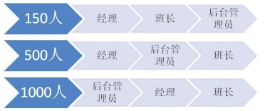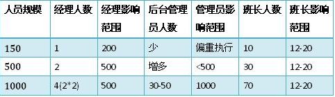 當(dāng)員工人數(shù)在150人的時(shí)候,班長(zhǎng)往往有10位左右。經(jīng)理能有足夠的精力來(lái)兼顧全局,甚至和大部分員工認(rèn)識(shí),親自制定關(guān)鍵流程和制度,參與每次的重要信息傳達(dá)。那么這個(gè)時(shí)候,經(jīng)理無(wú)疑是最為重要的管理者。班長(zhǎng)是第二重要的,后臺(tái)管理員(質(zhì)檢、維護(hù)、投訴處理、綜合行政等)就更多是個(gè)執(zhí)行角色。