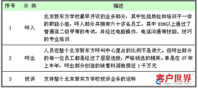 北京新東方學(xué)校呼叫中心在1999年還只是3部咨詢(xún)電話,不到10名工作人員。到今年,已經(jīng)擁有36個(gè)座席以及72名經(jīng)過(guò)專(zhuān)業(yè)培訓(xùn)的座席代表,平均每日接聽(tīng)3500通電話。