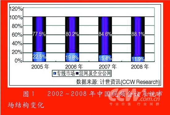從市場結(jié)構(gòu)上看,混網(wǎng)及Internet軟件視頻會(huì)議系統(tǒng)市場已經(jīng)形成了對專線市場的主導(dǎo)地位的挑戰(zhàn),僅2004年,專線市場就比2003年下降了19.5個(gè)百分點(diǎn),到2005年混網(wǎng)及企業(yè)公網(wǎng)市場份額達(dá)到77.5%,而在2006年,混網(wǎng)及Internet視頻會(huì)議系統(tǒng)已經(jīng)達(dá)到80.2%的市場占有率,基本占據(jù)了市場的主導(dǎo)地位。