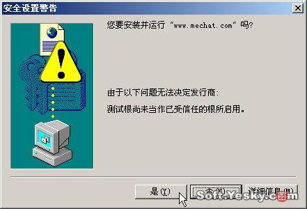 初次進入MeChat聊天室,瀏覽器會彈出如圖25所示的安全設(shè)置警告,單擊“是”,然后程序會自動下載安裝MeChat語音與視頻聊天插件。