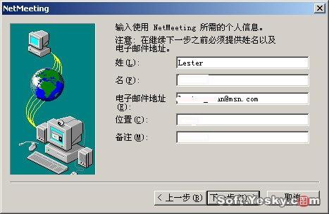 首次運行Netmeeting,軟件會出現(xiàn)一個向?qū),要求對用戶信息進行簡單的設(shè)定,單擊下一步,輸入個人信息,如圖4所示: