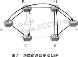 ....用圖2所示的6節(jié)點光網(wǎng)絡(luò)來闡述整個組播信令流程。與IP組播不同,點到多點LSP并不需要額外的組播組管理協(xié)議。這是因為葉子節(jié)點的地址直接被包括在請求中,而不像IP組播中僅僅只是使用一個D類地址。所有的組播樹請求都將用一個三元組來表示{T,a,L},其中T是組播樹的標(biāo)識符,s是源節(jié)點,L是組播樹的葉子集合。當(dāng)T等于O的時候意味著這是一個組播樹建立請求。例如,源節(jié)點A希望建立一個到葉子E和F的組播樹,那么這個請求就被表示為{0,A,{E,F(xiàn)}}。當(dāng)這顆樹被建立后,它將被分配一個全局唯一的標(biāo)識符,比如1。請求{1,A,{C1}}和{1,A,{F}}則分別意味著將葉子C嫁接到組播樹1和將葉子F從組播樹1中剪除。如果想刪除整棵樹,只需要將組播樹1的所有葉子都剪除即可,即{1,A,{C,E}}。