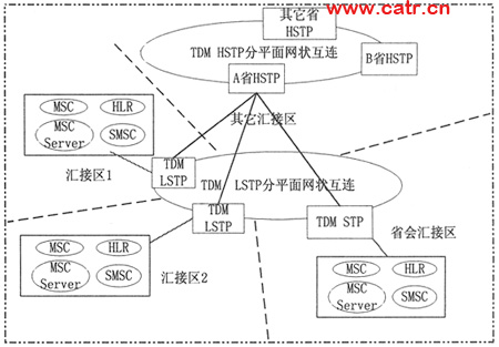 按照混合方式的網(wǎng)絡(luò)組織如下:作為T(mén)DM信令網(wǎng)的補(bǔ)充,IP STP和TDM STP共同承擔(dān)省會(huì)匯接區(qū)的業(yè)務(wù)。IP