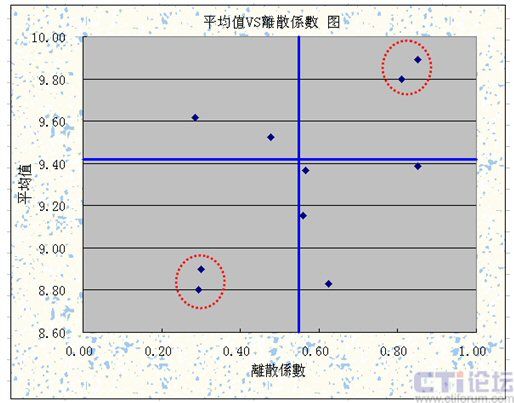 利用散點圖很容易找出我們的內部標竿,例如下面這張圖是每個班組小休率在12月份的平均值和離散系數(shù),可以清楚的看到,這四個象線的左下角,有兩個班組的小休率的平均值低于9以下,有一個班組甚至在8.8左右,這兩個班組不只是平均值最低,而且在12月份每一天的小休率也是控管的最好,差異是最小的。