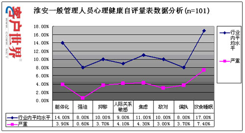 目前,員工壓力和心理健康情況已成為困擾整個(gè)行業(yè)的主要問(wèn)題之一,我們通過(guò)專(zhuān)業(yè)方法對(duì)淮安中心的員工心理健康和壓力狀況進(jìn)行了科學(xué)的測(cè)量,以了解該中心員工的壓力和心理健康狀況,具體測(cè)量數(shù)據(jù)如下: