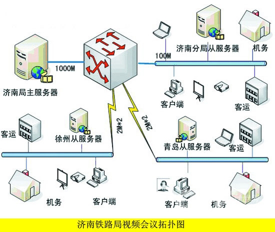 由于路局改革后組織結(jié)構(gòu)的特點,決定了跨地域會議較多,如濟南和徐州、青島之間召開的部門級別的會議比較頻繁,加上三地之間的帶寬制約,本方案采用了主從服務(wù)器的系統(tǒng)架構(gòu),1主3從,主服務(wù)器設(shè)置在路局網(wǎng)絡(luò)中心,原來濟南分局位置設(shè)置1臺從服務(wù)器,負(fù)責(zé)濟南地區(qū)的內(nèi)部會議,以及與其他2地的遠程會議,同樣徐州、青島也各設(shè)置1臺從服務(wù)器。