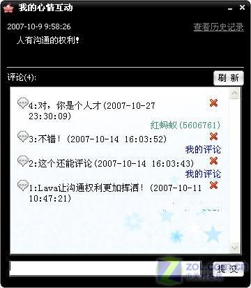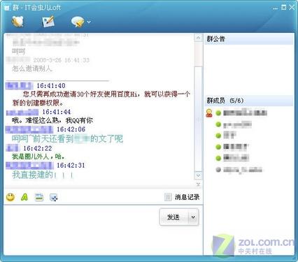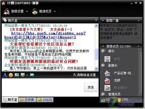 在群聊的過程中兩款軟件都各特色。百度Hi的特色是當用戶向群中一個不是自己好友的人發(fā)送信息時,該用戶會在百度網頁短信息中可以收到消息,此項功能十分適合上班時不能打開聊天軟件的朋友使用。Lava則是將群功能體現的更加強大些,除了消息發(fā)送外可以建立屬于群部落的文件庫,就是這個部落的藏寶室,有什么好東東都可以放進去,簡直就是超大的網絡硬盤。(圖9、圖10)