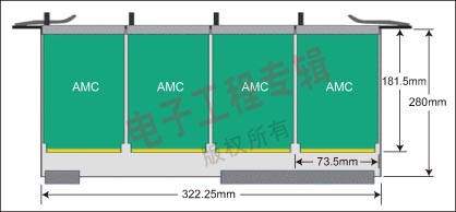 為了提高ATCA設(shè)計(jì)的模塊化性能,PICMG開(kāi)發(fā)了高級(jí)夾層卡(AMC)規(guī)范。在ATVA卡上放置這些模塊后就可以使它們?cè)L問(wèn)背板連接,因此這些模塊可以用來(lái)定制ATCA卡上的I/O,并用來(lái)裝載處理器和存儲(chǔ)外設(shè)。一塊ATCA卡最多能夠放4個(gè)AMC模塊(見(jiàn)圖1),因此設(shè)計(jì)師用一個(gè)卡即可實(shí)現(xiàn)多種不同的配置。就像ATCA卡一樣,AMC模塊同樣可以實(shí)現(xiàn)單個(gè)模塊的遠(yuǎn)程系統(tǒng)管理和熱交換功能。