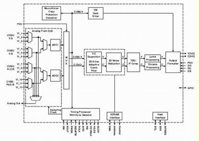 圖2所示為視頻解碼器的數(shù)據(jù)流路徑,它負責處理NTSC、PAL、SECAM、S-Video、SCART、YPbPr、RGB、480p和其它輸入格式。在數(shù)字電視中,對這種級別的靈活性的支持是必需的,完全是為了讓一個機型經(jīng)過實際設(shè)置可以工作于任何格式。數(shù)字電視解碼器的典型性能特征包括:同步、消隱、場、有源視頻窗口、水平和垂直同步、時鐘、同步鎖相(用于下行視頻編碼同步)、主CPU中斷和可編程邏輯I/O信號。這是對數(shù)字視頻輸出以及用于先進的垂直消隱期(VBI)數(shù)據(jù)恢復的補充。作為一種附加功能,一些視頻解碼器支持VBI數(shù)據(jù)處理器(VDP)在文字電視廣播、傳送字幕(CC)和其它VBI數(shù)據(jù)上進行數(shù)據(jù)分片、解析和執(zhí)行誤碼校驗。內(nèi)置的FIFO存儲多達11行文字電視廣播數(shù)據(jù),而適當?shù)闹鹘涌谕郊叭聊晃淖蛛娨晱V播恢復是當今系統(tǒng)中的幾個常見要求。然而,一些實現(xiàn)方案需要一種解碼器,它能夠為基于主CPU的VBI處理提供速度為已采樣原始亮度數(shù)據(jù)兩倍的輸出格式化數(shù)據(jù)。