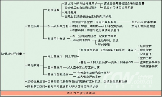 在給某移動(dòng)運(yùn)營(yíng)商進(jìn)行的接通率優(yōu)化咨詢(xún)項(xiàng)目中,利用呼叫中心接通率優(yōu)化模型進(jìn)行了分析,圖2是針對(duì)分流呼叫中心總體呼叫量所提出的建議措施。