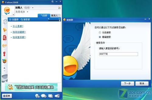 在圖4中,切換到“飛信群”選項(xiàng),單擊“搜索群”按鈕,在彈出的“搜索群”對話框中點(diǎn)選“精確搜索”,最后輸入“群號(hào)碼”并單擊“下一步”按鈕(如圖10)。