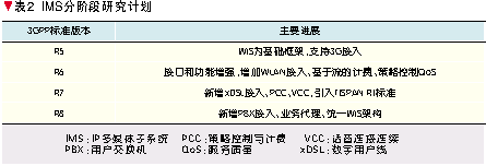 3GPP依照UMTS 3G移動通信系統(tǒng)的系列標(biāo)準(zhǔn)版本定義了IMS的分階段演進計劃[5],如表2所示。其中,2002年完成的R5是第一個全IP移動網(wǎng)絡(luò)標(biāo)準(zhǔn),它將核心網(wǎng)歸為一個統(tǒng)一的基于IP的分組(PS)域,具有服務(wù)質(zhì)量(QoS)保證,能夠提供各種類型的多媒體增值業(yè)務(wù),其核心技術(shù)標(biāo)準(zhǔn)就是IMS。R6進一步完善IMS接口和功能,增加對于WLAN的接入支持,并研究IMS域的計費和QoS控制技術(shù)。R7融合TISPAN關(guān)于NGN的研究標(biāo)準(zhǔn),增加對于xDSL接入技術(shù)的支持,提出策略控制與計費(PCC)技術(shù)以及WLAN/3G語音連續(xù)通信的話音連接連續(xù)(VCC)技術(shù)。正在研究中的R8將協(xié)同各個標(biāo)準(zhǔn)化組織的工作,研究支持組合業(yè)務(wù)的業(yè)務(wù)代理技術(shù)以及下一步的統(tǒng)一IMS架構(gòu)。