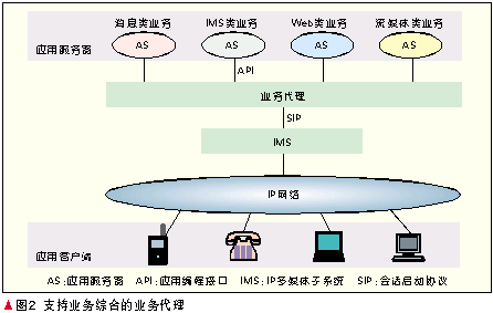 經(jīng)過多年的探索,業(yè)界取得共識網(wǎng)絡(luò)演進必須基于業(yè)務(wù)驅(qū)動的策略。必須指出的是,雖然基于SIP技術(shù)的IMS支持的業(yè)務(wù)從語音業(yè)務(wù)擴展到了寬帶多媒體業(yè)務(wù),然而其控制機理本質(zhì)上還是源于傳統(tǒng)電信網(wǎng),因此它最適合于提供的還是諸如VoIP、集群話音、集群視頻等實時會話型業(yè)務(wù),諸如Web、電子商務(wù)等純數(shù)據(jù)型業(yè)務(wù)并不適合由IMS提供,其他許多有前景的業(yè)務(wù),如流媒體業(yè)務(wù)、IPTV、消息類業(yè)務(wù)等的確IMS已提出或正在積極研究其提供方法,但是已有其他的非IMS提供方式。因此,切不要認(rèn)為IMS是包羅萬象的,更確切地說,IMS是電信界提出的網(wǎng)絡(luò)融合技術(shù),考慮得更多的必然就是和傳統(tǒng)電信業(yè)務(wù)模式類似的業(yè)務(wù)。為了使IMS在未來融合的信息通信網(wǎng)絡(luò)中繼續(xù)保持其重要的地位,在積極研究擴大IMS業(yè)務(wù)能力的同時,必須研究新的體系結(jié)構(gòu)既能夠包容IMS型業(yè)務(wù),也能夠包容非IMS型業(yè)務(wù),由此形成融合的開放式的業(yè)務(wù)平面。這就是熱點研究之中的業(yè)務(wù)代理技術(shù),實際上就是架構(gòu)在IMS之上的綜合業(yè)務(wù)平臺,如圖2所示。它至少能夠提供4大類業(yè)務(wù):IMS類業(yè)務(wù)、消息類業(yè)務(wù)、流媒體業(yè)務(wù)、Web業(yè)務(wù)以及它們的組合,也就是說,除了IMS系統(tǒng)的SIP協(xié)議和API以外,業(yè)務(wù)平臺還應(yīng)能支持其他眾多的非IMS系統(tǒng)協(xié)議和接口,由此構(gòu)成融合的業(yè)務(wù)層。IMS系統(tǒng)是其中的一個重要組成部分,擔(dān)負(fù)起通信網(wǎng)絡(luò)的融合重任。
