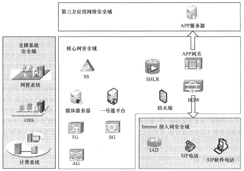核心網(wǎng)安全域包括所有的軟交換機(jī),TG、AG、SG等接入網(wǎng)關(guān),BGW類設(shè)備,關(guān)鍵業(yè)務(wù)平臺(tái)(包括SHLR、號(hào)碼轉(zhuǎn)換平臺(tái)等),軟交換媒體服務(wù)器和應(yīng)用服務(wù)器,開(kāi)發(fā)給第三方業(yè)務(wù)接口的應(yīng)用網(wǎng)關(guān)。Internet接入網(wǎng)安全域包括所有分配公網(wǎng)地址的SIP電話終端、IAD類設(shè)備、各類SIP接入的PC等。支撐系統(tǒng)安全域包括網(wǎng)管、計(jì)費(fèi)和OSS等輔助運(yùn)營(yíng)系統(tǒng)。第三方應(yīng)用網(wǎng)絡(luò)安全域主要包括所有以開(kāi)發(fā)業(yè)務(wù)接口方式接入的應(yīng)用服務(wù)器,鑒于目前實(shí)際應(yīng)用中很少涉及到這種應(yīng)用,這里不討論該區(qū)域的安全需求。
