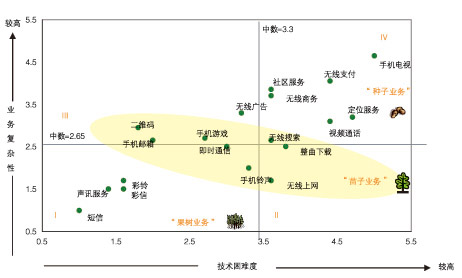 根據(jù)“業(yè)務(wù)復(fù)雜性—技術(shù)困難度”模型,可以清晰地看到一個業(yè)務(wù)的成功商用和業(yè)務(wù)復(fù)雜性與技術(shù)困難度密切相關(guān),如短信和彩鈴等復(fù)雜性與技術(shù)困難度都很低的業(yè)務(wù)是比較容易成功商用的,將這一類業(yè)務(wù)歸類為“果樹業(yè)務(wù)”,在第一象限(象限I)。還有一些業(yè)務(wù)如即時通信、整曲下載和無線搜索等業(yè)務(wù),已經(jīng)開始快速增長但是其用戶規(guī)模和收入量都還低于“果樹業(yè)務(wù)”,在業(yè)務(wù)復(fù)雜性與技術(shù)困難度坐標(biāo)中這類業(yè)務(wù)處于4個象限交匯的中部區(qū)域(即圖中黃色區(qū)域),由于業(yè)務(wù)復(fù)雜性和技術(shù)困難度都會隨時間而減小,從而這一區(qū)域的業(yè)務(wù)會向第一象限演進(jìn),這類業(yè)務(wù)稱為“苗子業(yè)務(wù)”,即在3年內(nèi)能夠成熟的業(yè)務(wù)。在坐標(biāo)系的右上角第四象限,即業(yè)務(wù)復(fù)雜性和技術(shù)困難度均較高的業(yè)務(wù),稱之為“種子業(yè)務(wù)”,這類業(yè)務(wù)在短期內(nèi)很難快速成長。