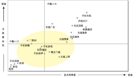 諾基亞西門子通信借鑒國外的無限增值業(yè)務(wù)經(jīng)驗和對國內(nèi)運營商業(yè)務(wù)的分析提出“技術(shù)困難度—業(yè)務(wù)復(fù)雜性”模型來詮釋無線增值業(yè)務(wù)。
