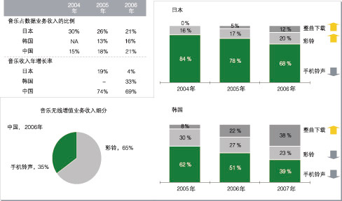 彩鈴在中國倍受青睞并且仍具發(fā)展?jié)摿,在日本和韓國,手機鈴聲和整曲下載占據(jù)著手機音樂的主導(dǎo)地位,如圖3所示。