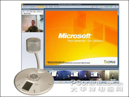微軟Office RoundTable,音頻-視頻協(xié)作設(shè)備,帶有一個(gè)獨(dú)特的 360 度相機(jī)。在結(jié)合 Office Communications Server 2007 使用時(shí),RoundTable 還可交付卓越的會議體驗(yàn):將會議環(huán)境擴(kuò)展到多個(gè)位置。現(xiàn)場及遠(yuǎn)程位置的與會人員可以全景查看會議室中的每位成員,還可以在輪流發(fā)言時(shí)拉近特寫某個(gè)與會者。