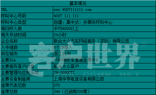 2007年秋天,聯(lián)合大眾汽車網(wǎng)絡服務(深圳)有限公司現(xiàn)代化、智能化的大型全國電話呼叫中心落成并投入使用。從投入使用至今,呼叫中心經(jīng)歷了從無到有、不完善到健全的發(fā)展歷程,聯(lián)合大眾24小時全國服務熱線現(xiàn)已成為客戶價值與公司價值之間傳遞的橋梁。