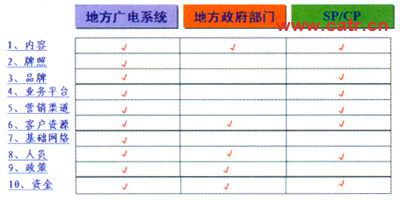 在投資與收益方面,雙方共同出資,成立公司,調(diào)動雙方相關(guān)的優(yōu)勢資源。并且協(xié)調(diào)了與SP/CP、政府、行業(yè)部門等多方面原本復雜的關(guān)系。能夠增加的收入是點播和直播節(jié)目收費。收費模式方面增加電視包月費、頻道組合費。合作分成通過股份公司分紅。