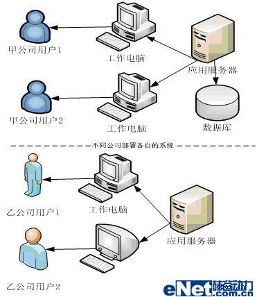 傳統(tǒng)軟件是在公司內(nèi)部架設(shè)軟件運(yùn)行環(huán)境,自己購(gòu)買(mǎi)應(yīng)用服務(wù)器、數(shù)據(jù)庫(kù)服務(wù)器、網(wǎng)卡等硬件,安裝自己的局域網(wǎng)并在局域網(wǎng)內(nèi)部署軟件。所以不同公司都各自部署一套自己的系統(tǒng)。不同公司的用戶(hù)事實(shí)是通過(guò)不同的途徑訪問(wèn)不同的系統(tǒng),如圖2所示: