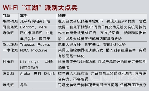 “江湖”上的各家門派憑借其獨(dú)特的武功和教義,吸引了眾多門徒和崇拜者,具有不同程度的民間響應(yīng)力。而WLAN各大門派同樣如此,雖然技術(shù)派別五花八門,但除了順應(yīng)技術(shù)潮流和使產(chǎn)品線在市場上更具競爭力外,最重要的因素仍然是為了更好地滿足用戶需求;蛘邠Q句話說,有多少種用戶需求,就會(huì)對應(yīng)什么樣的門派。因此,在針對系統(tǒng)架構(gòu)和技術(shù)因素進(jìn)行區(qū)分后,我們還可以從用戶角度出發(fā)來看不同的門派。
