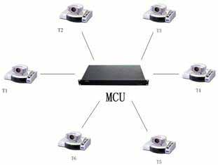 在會議場點數目不多且地域分布比較集中時,可采用單MCU方式,其組網結構見圖所示。圖中T1-T6均為視頻會議終端系統(tǒng)設備。