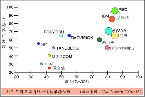 從當(dāng)前國(guó)內(nèi)統(tǒng)一通信市場(chǎng)競(jìng)爭(zhēng)格局來(lái)看,在綜合技術(shù)實(shí)力方面,根據(jù)廠商所提供的統(tǒng)一通信解決方案中所能夠提供的各種溝通方式融合的程度以及每個(gè)具體功能技術(shù)水平等綜合因素考慮,處于前幾位的分別是思科、微軟、北電、IBM和Avaya,它們的產(chǎn)品線比較長(zhǎng),產(chǎn)品功能也相對(duì)比較全面。