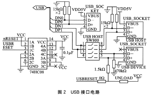在ARM9開發(fā)板內(nèi)部含有1個USB2.O接口控制器,接口電路如圖2所示。共有3個LISB接口(2個Host和1個Device),通過選擇開關(guān)SW800進(jìn)行選通控制。74HC08作為4個二輸入與門邏輯電路,負(fù)責(zé)控制信號的邏輯組合。該接口用來連接USB接口的外部設(shè)備。