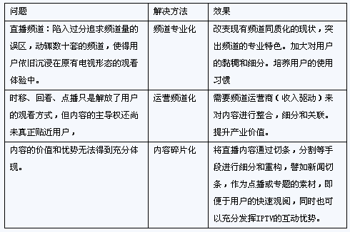 IPTV發(fā)展中,傳統(tǒng)視頻業(yè)務(wù)既是切入點(diǎn),同時(shí)也是業(yè)務(wù)收入的重要來(lái)源。但目前視頻業(yè)務(wù)的價(jià)值還未得到充分體現(xiàn)。互動(dòng)性優(yōu)勢(shì)還未得到充分挖掘。