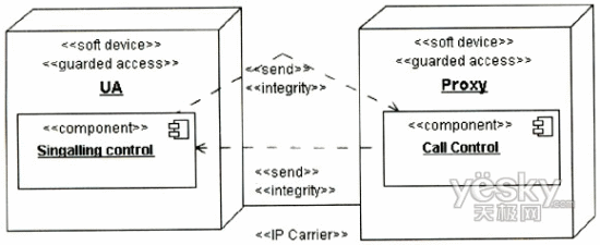 下面以基于SIP的兩方會話為例說明如何使用UMLsec描述業(yè)務(wù)安全需求。假定兩方呼叫發(fā)生在同一SIPProxy轄域的兩個用戶之間,要求保證用戶UA與SIPProxy之間的信令的完整性,不能被非法入侵者篡改。該場景的用例圖和部署圖分別如圖2、圖3所示。