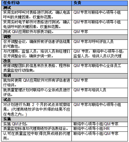 4. 開展項(xiàng)目交流。管理人員必須就新的或者修繕后的QM計(jì)劃與代理商進(jìn)行交流。QM的成功與否與代理商的合作密不可分,如果代理商受邀參與新QM計(jì)劃的開發(fā)并且所有改變都在雙方之間明確交流過,那么成功的機(jī)會也將大大提高。交流的內(nèi)容應(yīng)包括為什么要開發(fā)這樣一個(gè)計(jì)劃,它的作用和職責(zé)是什么,它對代理商會產(chǎn)生哪些影響(對于他們的評估和提升)以及它能帶來哪些好處。幫助代理商認(rèn)識到QM計(jì)劃積極的一面很重要,因?yàn)橹挥羞@樣才能讓他們看到QM不僅僅是管理人員用來告訴他們做錯了事情的一種手段。讓聯(lián)絡(luò)中心全體員工參與QM計(jì)劃的開發(fā)能夠建立他們對該計(jì)劃的支持,提高接受度的同時(shí)避免不知所措。這對聯(lián)絡(luò)中心剛剛嶄露頭角,QM計(jì)劃還未全面鋪開的中國市場而言尤為重要。