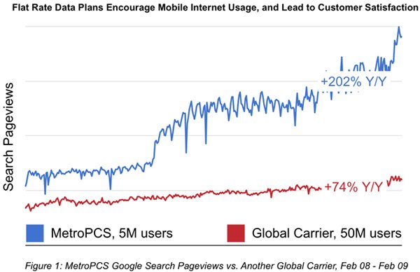 這里以美國一家地區(qū)性的小運(yùn)營商MetroPCS為例,MetroPCS的CDMA用戶數(shù)剛超過500萬。在過去的一年里,MetroPCS的Google搜索量增長了2.5倍。而這個數(shù)字,是那些全球性的、擁有大量用戶和3G網(wǎng)絡(luò)運(yùn)營商的10倍。