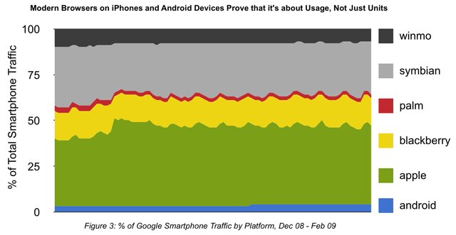 這里有個例子:iPhone、Android手機(jī)雖然僅占到智能手機(jī)市場份額的13%,卻貢獻(xiàn)了50%的智能手機(jī)Google搜索流量(Google訪問)。