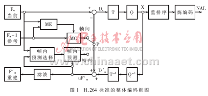 Abstraction Layer),負(fù)責(zé)對數(shù)據(jù)進行打包和傳送。H.264編碼圖像通常分為三種類型:I幀、P幀、B幀。I幀為幀內(nèi)編碼幀,其編碼不依賴于已編碼的圖像數(shù)據(jù)。P幀為前向預(yù)測幀,B幀為雙向預(yù)測幀,編碼時都需要根據(jù)參考幀進行運動估計。同時,H.264在提高圖像傳輸容錯性方面做了大量工作,重新定義了適于圖像的結(jié)構(gòu)劃分。在編碼時,圖像幀各部分被劃分到多個Slice結(jié)構(gòu)中,每個Slice都可以被獨立編碼,不受其他部分影響。Slice由圖像最基本的結(jié)構(gòu)——宏塊組成,每個宏塊包含一個16×16的亮度塊和兩個8×8的色度塊。H.264標(biāo)準(zhǔn)的整體編碼框圖如圖1所示。編碼過程中,原始數(shù)據(jù)進入編碼器后,當(dāng)采用幀內(nèi)編碼時,首先選擇相應(yīng)的幀內(nèi)預(yù)測模式進行幀內(nèi)預(yù)測,隨后對實際值和預(yù)測值之間的差值進行變換、量化和嫡編碼,同時編碼后的碼流經(jīng)過反量化和反變換之后重構(gòu)預(yù)測殘差圖像,再與預(yù)測值相加得出重構(gòu)幀,得出的結(jié)果經(jīng)過去塊濾波器平滑后送入幀存儲器。采用幀間編碼時,輸入的圖像塊首先在參考幀中進行運動估計,得到運動矢量。運動估計后的殘差圖像經(jīng)整數(shù)變換、量化和嫡編碼后與運動矢量一起送入信道傳輸。同時另一路碼流以相同的方式重構(gòu)后,經(jīng)去塊濾波后送入幀存儲器作為下一幀編碼的參考圖像。