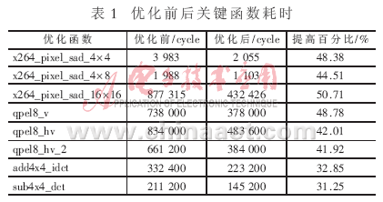 采用以上優(yōu)化方法對編碼關(guān)鍵函數(shù)進行優(yōu)化,優(yōu)化前后函數(shù)耗時如表1所示?梢,以上優(yōu)化方法能大幅度減少編碼時間。