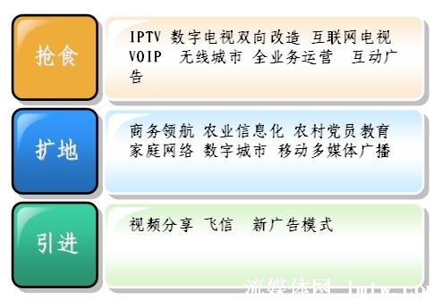 從廣義上講,廣電、電信、互聯(lián)網都屬于信息行業(yè),現(xiàn)在都面臨著自己在增長中遇到的問題,也就是滯漲。滯漲逼迫大家必須去轉型,轉型現(xiàn)在有三種方式,一個是搶,一個是擴,一個是引進。從最近會議上來看,目前大家對搶食比較感興趣,畢竟有現(xiàn)成的一碗紅燒肉已經做好了,對后面兩個,相對來說談得還比較少,因為后面兩個,需要引入一些創(chuàng)新的技術,引入創(chuàng)新的思維。
