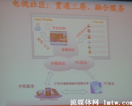 百視通在數(shù)月前便發(fā)布了三屏融合戰(zhàn)略,據(jù)李川介紹,百視通是從節(jié)目分享開(kāi)始著手的。比如發(fā)一個(gè)片花到手機(jī)上,用戶(hù)喜歡的話(huà)可以定制,IPTV上設(shè)一個(gè)入口,兩相對(duì)接,用戶(hù)點(diǎn)一兩個(gè)鍵就可以很方便的看到他需要的視頻,從而解決了不斷翻頁(yè)造成用戶(hù)流失的問(wèn)題。而在電腦上,也可以實(shí)現(xiàn)這樣的定制,甚至是異地傳送。亦即即使出差在外地,也可以很簡(jiǎn)單的通過(guò)互聯(lián)網(wǎng)定制IPTV節(jié)目送給家人、朋友。