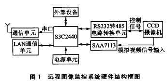 本系統(tǒng)采用三星公司的S3C2440嵌入式處理器和arm-linux2.4.26操作系統(tǒng);S3C2440使用ARM920T內(nèi)核,主頻是400MHz;除了集成通用的串口控制器、USB控制器、A/D轉(zhuǎn)換器和GPIO等功能之外,還集成了一個攝像頭接門(CAMIF)(這個接口是遠程圖像采集的核心部分)。系統(tǒng)在S3C2440處理器的控制下,從CCD攝像機采集模擬視頻信號,然后經(jīng)過編碼、DMA傳輸?shù)絻?nèi)存緩沖,接著由軟件對內(nèi)存中的數(shù)字視頻數(shù)據(jù)進行壓縮和打包.最后通過通信單元將圖像以IP包的方式發(fā)送到監(jiān)控中心的服務器。整個系統(tǒng)的硬件結(jié)構(gòu)原理如圖1所示