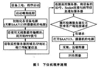 下位機軟件通過驅(qū)動程序提供的接口,在遠程圖像監(jiān)控設備中完成硬件的初始化、控制等功能,同時又負責圖像的壓縮和傳輸。它是所有設備的控制中樞,因此這里著重描述下位機軟件的工作流程,如圖5所示。