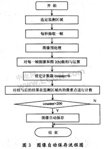 對(duì)每一幀都做上述處理,經(jīng)過(guò)一段時(shí)間的監(jiān)測(cè)后,系統(tǒng)會(huì)自動(dòng)保存一些危險(xiǎn)情況存在時(shí)的圖像(灰度圖形式)。圖像自動(dòng)保存方法流程圖如圖3所示。