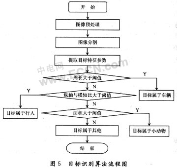 根據(jù)運(yùn)動(dòng)目標(biāo)的分類可知,車輛的周長(zhǎng)是最長(zhǎng)的,所以首先直接判斷圖像中運(yùn)動(dòng)目標(biāo)的周長(zhǎng),如果大于某一設(shè)定好的閾值,則可輕易判斷出視場(chǎng)中目標(biāo)屬于車輛。余下的目標(biāo)中,行人比小動(dòng)物的縱橫軸比值大,設(shè)定縱橫軸比閾值,據(jù)此可以判斷出目標(biāo)屬于行人。最后將設(shè)定一個(gè)面積閾值,面積大于此閾值則可判斷目標(biāo)屬于小動(dòng)物,否則目標(biāo)屬于其他一些環(huán)境的干擾。