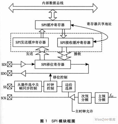 dsPIC30F6014提供了2個SPI接口模塊,每個接口模塊包括三個特殊功能寄存器和四個引腳。SPIxBUF是數(shù)據(jù)緩沖寄存器。需要注意的是,接收緩沖SPIxRBF和發(fā)送緩沖SPIxTBF共享同一個地址,即它們都是地址映射到SPIxBUF的。也就是說,當對接收或發(fā)送緩沖寄存器操作時,都只能對SPIxBUF進行操作,而不能直接對SPIxRBF或SPIxTBF進行操作。SPIxCON是控制寄存器,用來對sPI模塊的操作模式等進行配置;SPIxSTAT是狀態(tài)寄存器,用來標示SPI模塊所處的狀態(tài)。其模塊框圖如圖1所示。