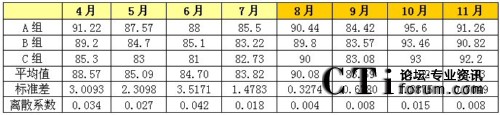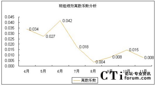 無論從標(biāo)準(zhǔn)差的走勢還是從離散系數(shù)的走勢上來看,8-11月各班組的績效得分差距明顯比4-7月的績效得分差距要小。從另一個角度來看,就是該呼叫中心各班組的績效水平更趨于均衡,呼叫中心人員的整體技能和服務(wù)水平的二極化差異開始縮小。