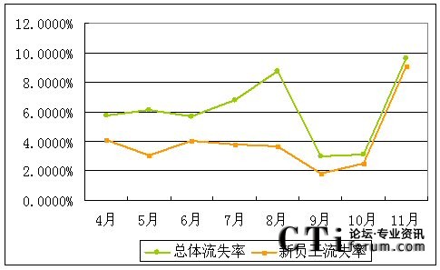 從該中心的運(yùn)營數(shù)據(jù)來看,另一個發(fā)生明顯變化的就是實行團(tuán)隊激勵后新員工的流失率開始明顯增加。以下是我們提取4-11月該呼叫中心員工流失方面的數(shù)據(jù):