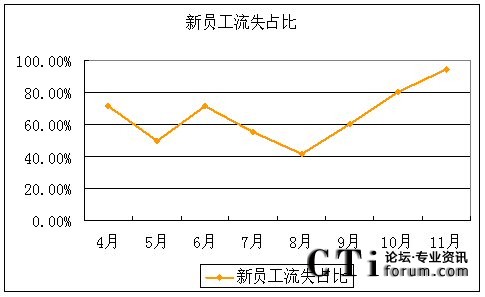 從上表中可以看出,該呼叫中心的總體流失率在4-11月期間并沒有呈現(xiàn)特別的趨勢性,11月份流失率的突增原因是在于該月有大量新員工(入職3個月內(nèi)的員工)流失,占到該月總流失人數(shù)的94.12%。