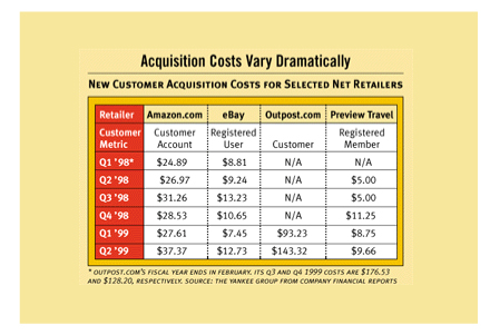 上世紀(jì)90年代末期DOT.COM就遭遇了這一嚴(yán)峻問題。70% - 80%的客戶在沒有完成采購之前就棄網(wǎng)站而去。對于許多人來說這被認(rèn)為是一個“行業(yè)基準(zhǔn)”,屬于可接受水平,但也有些人開始尋找解決方案。整個行業(yè)開始注意到分析家們的忠告:這一水平的放棄率是不被允許的。下面這張由Yankee集團(tuán)在2000年發(fā)布的表格向我們展示了電子商務(wù)企業(yè)客戶獲取成本螺旋形盤升的過程。