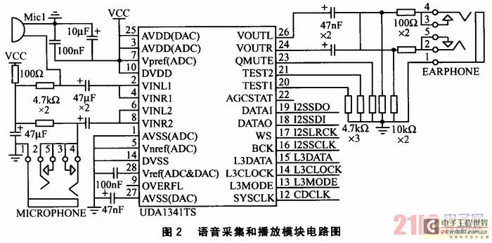 語(yǔ)音采集和播放模塊的作用是將音頻模擬信號(hào)轉(zhuǎn)換為數(shù)字信號(hào),并對(duì)信號(hào)進(jìn)行PCM編碼。其電路如圖2所示。采用Philips公司的UDA1341 TS型立體聲音頻CODEC進(jìn)行音頻編解碼。該芯片提供2個(gè)麥克風(fēng)輸入,可實(shí)現(xiàn)單端輸入、差分輸入等靈活配置,并設(shè)置了可編程增益放大器和自動(dòng)增益控制器,可保證高質(zhì)量的音頻獲;同時(shí),還集成了聽(tīng)筒和喇叭輸出的驅(qū)動(dòng)器,喇叭音量可以通過(guò)編程調(diào)整。S3C2440A-40微處理器與UDA1341TS編解碼器通過(guò)I2S總線直接相連,并采用DMA發(fā)送/接收方式,完成系統(tǒng)的錄音和放音。
