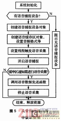 從音頻編解碼器中獲取數(shù)據(jù)時(shí),首先通過(guò)UDA1341TS采集語(yǔ)音信號(hào)放入語(yǔ)音捕捉緩存區(qū),應(yīng)用程序再?gòu)恼Z(yǔ)音捕捉緩沖獲取語(yǔ)音信號(hào)并發(fā)送。具體程序流程如圖5所示。