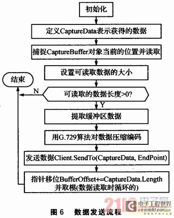 數(shù)據(jù)發(fā)送函數(shù)的作用是將語(yǔ)音捕捉緩沖區(qū)的數(shù)據(jù)通過(guò)Client.SendTo(CaptureData,EndPoint)函數(shù)發(fā)送到網(wǎng)絡(luò)上。當(dāng)線程發(fā)現(xiàn)有數(shù)據(jù)要讀取(即線程被觸發(fā))時(shí),就會(huì)循環(huán)調(diào)用數(shù)據(jù)發(fā)送函數(shù),直到?jīng)]有可讀的數(shù)據(jù)為止。CaptureBuffer為語(yǔ)音捕捉緩沖區(qū)對(duì)象。數(shù)據(jù)發(fā)送流程如圖6所示。